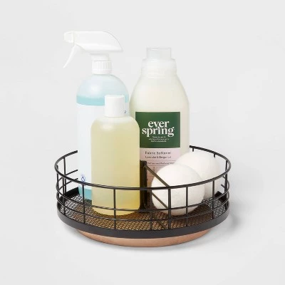 Store everyday items on a countertop while keeping them easily accessible with this Wire Divided Turntable with Natural Wood from Brightroom™. This divided turntable has a round silhouette that makes it ideal for organizing condiments in the refrigerator and household items in the bathroom cabinet. This decorative storage basket has a open black wire design with wooden base that adds a new level of stylish convenience to your home. Simply spot or wipe clean to keep it looking great.